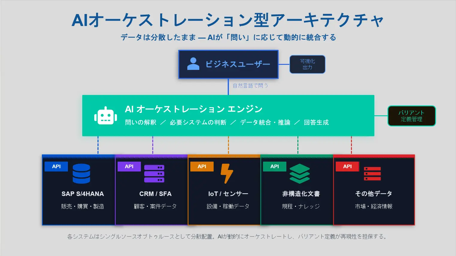 新しいアーキテクチャが⽬指す姿は、こうです。データは各システムがシングルソースオブトゥルースとして保持し、AIがオーケストレーション層として必要なデータを動的に統合する。⼈間はデータの構造を設計するのではなく、「何を知りたいか」を設計する。重要なKPIはバリアントとして明⽰的に管理し、再現性とガバナンスを確保する。