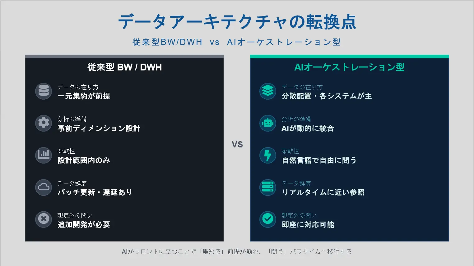 | 観点 | 従来型BW/DWH | AIオーケストレーション型 |