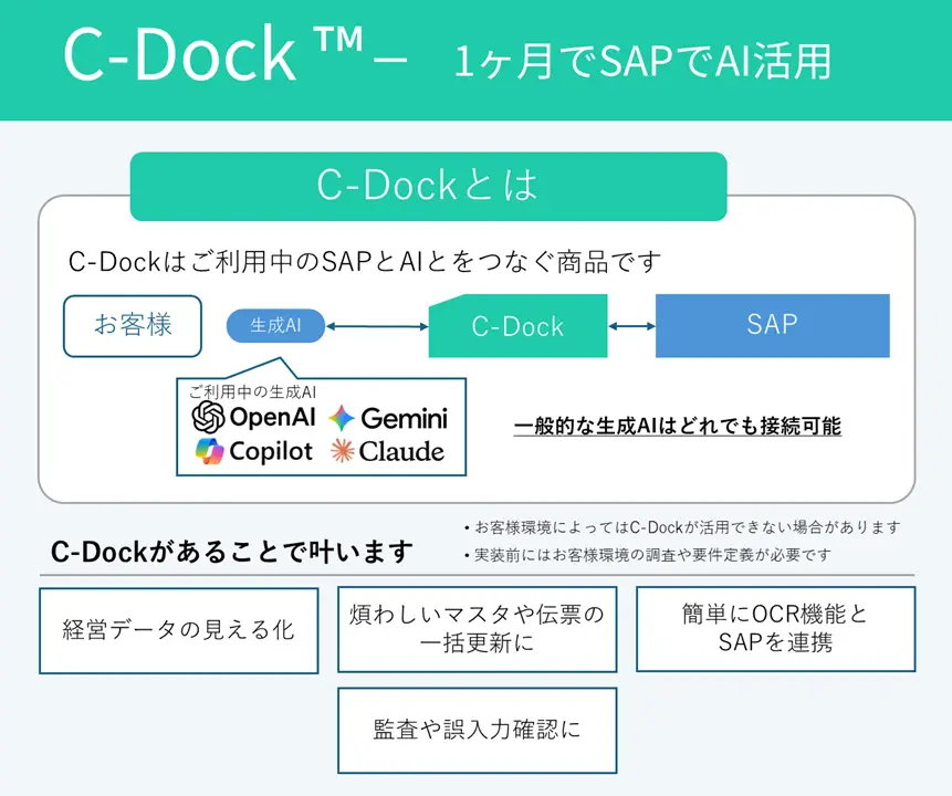 C-Dock for SAPは、SAPシステムと任意の⽣成AI(Claude、ChatGPT、Gemini、Copilot等)をMCPで接続するミドルウェア製品です。